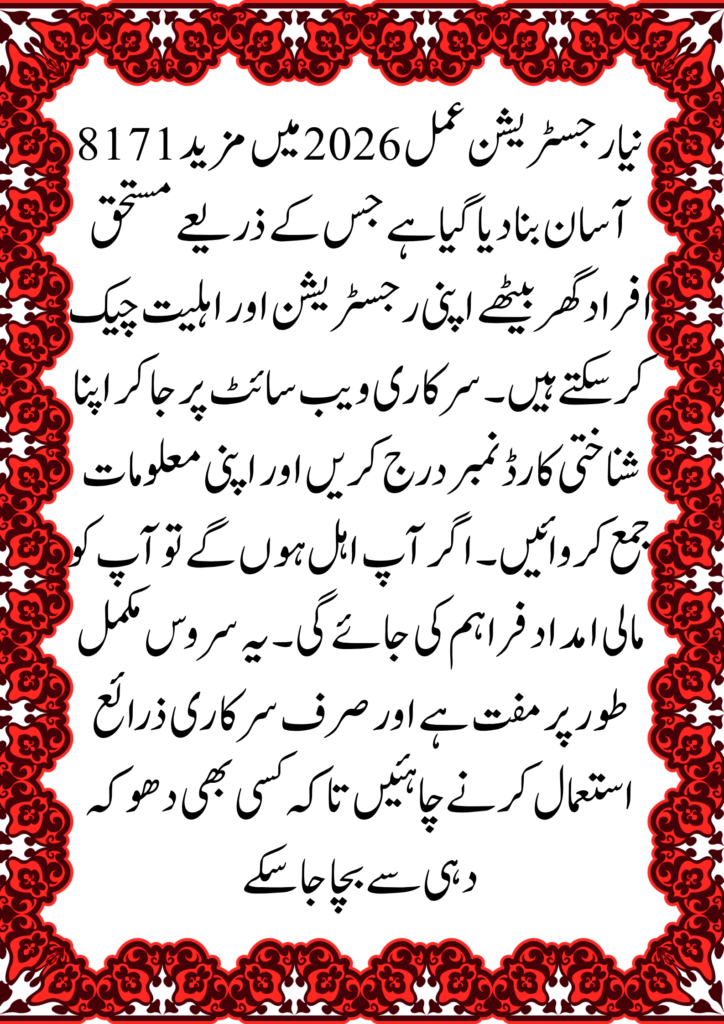 In 2026, the 8171 online system has made the process much easier. Using your CNIC (Computerised National Identity Card), you can register, check eligibility, and track payments from home without visiting offices.